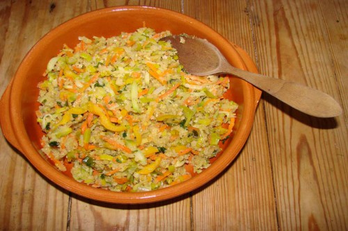 Acrescente a abobrinha, a cenoura e o pimentão amarelo. Refogue bem. Condimente com sal e o cheiro verde. Por último adicione a farinha de mandioca e misture bem.