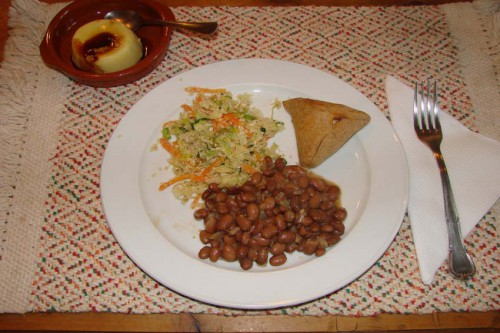 E serví com um feijãozinho, esfiha e pudim de limão.